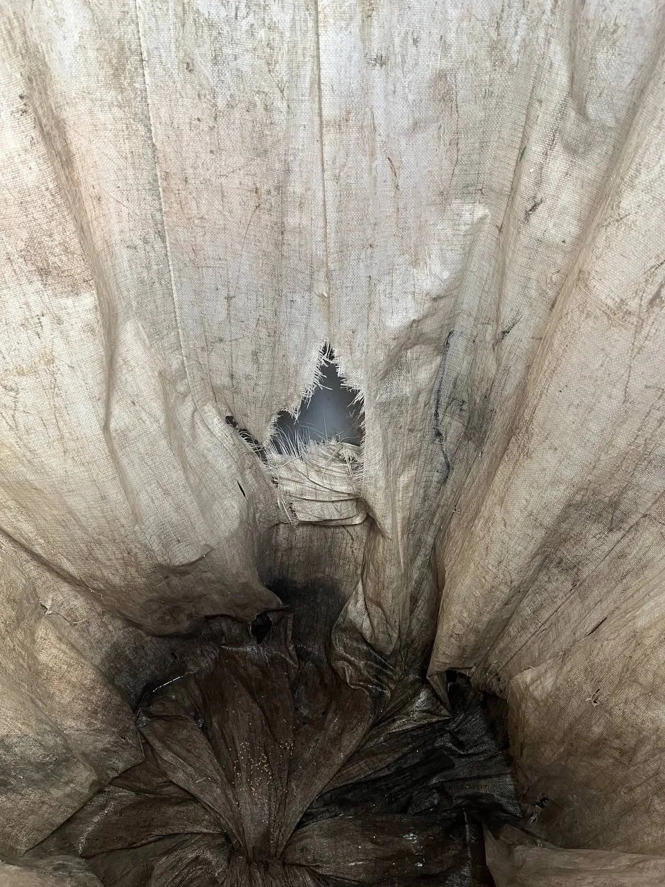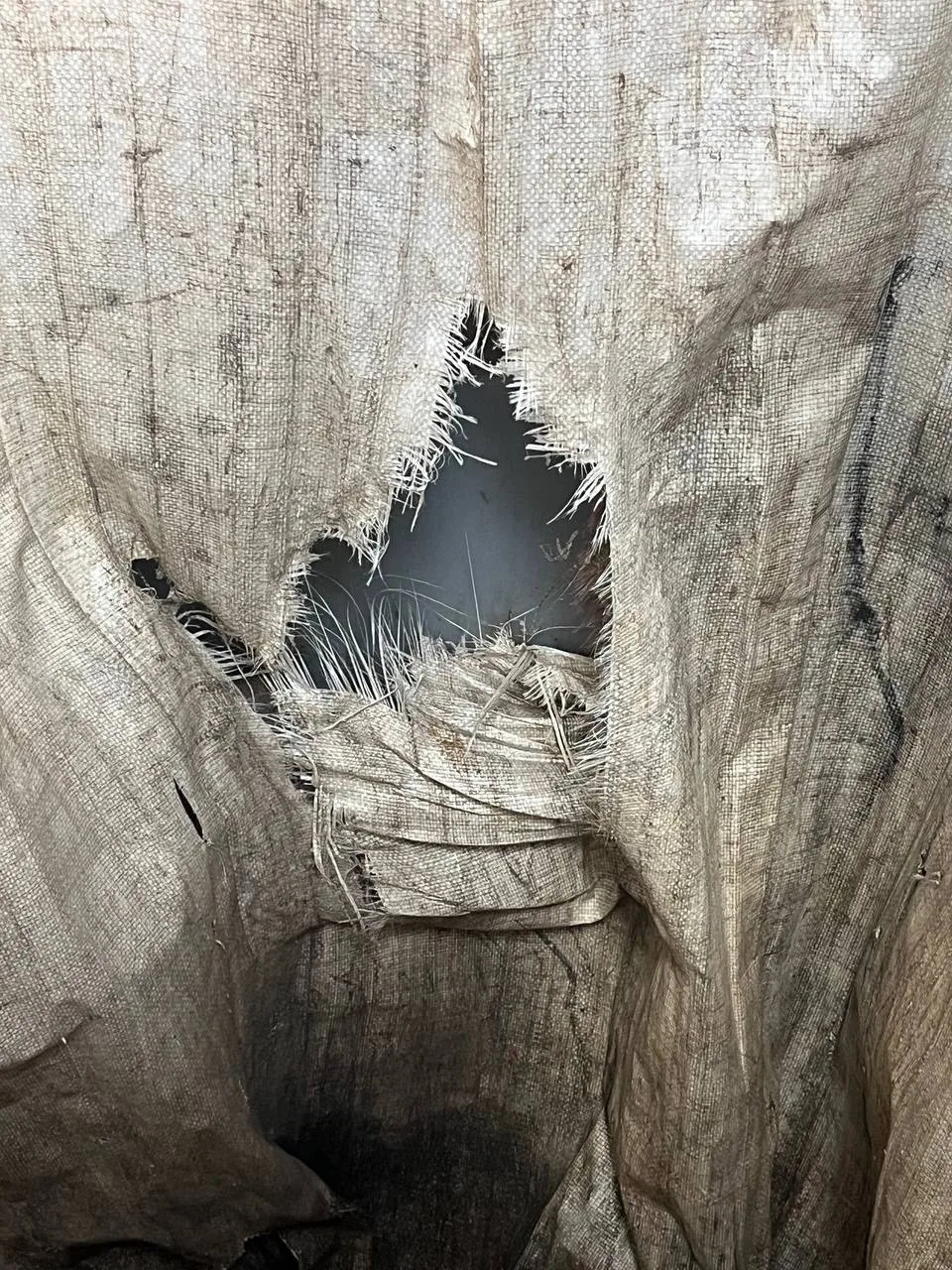 Предмет-виновник разрыва мешка | Разрыв мешка не подлежит ремонту | Размер трагедии в соотношении всего мешка |